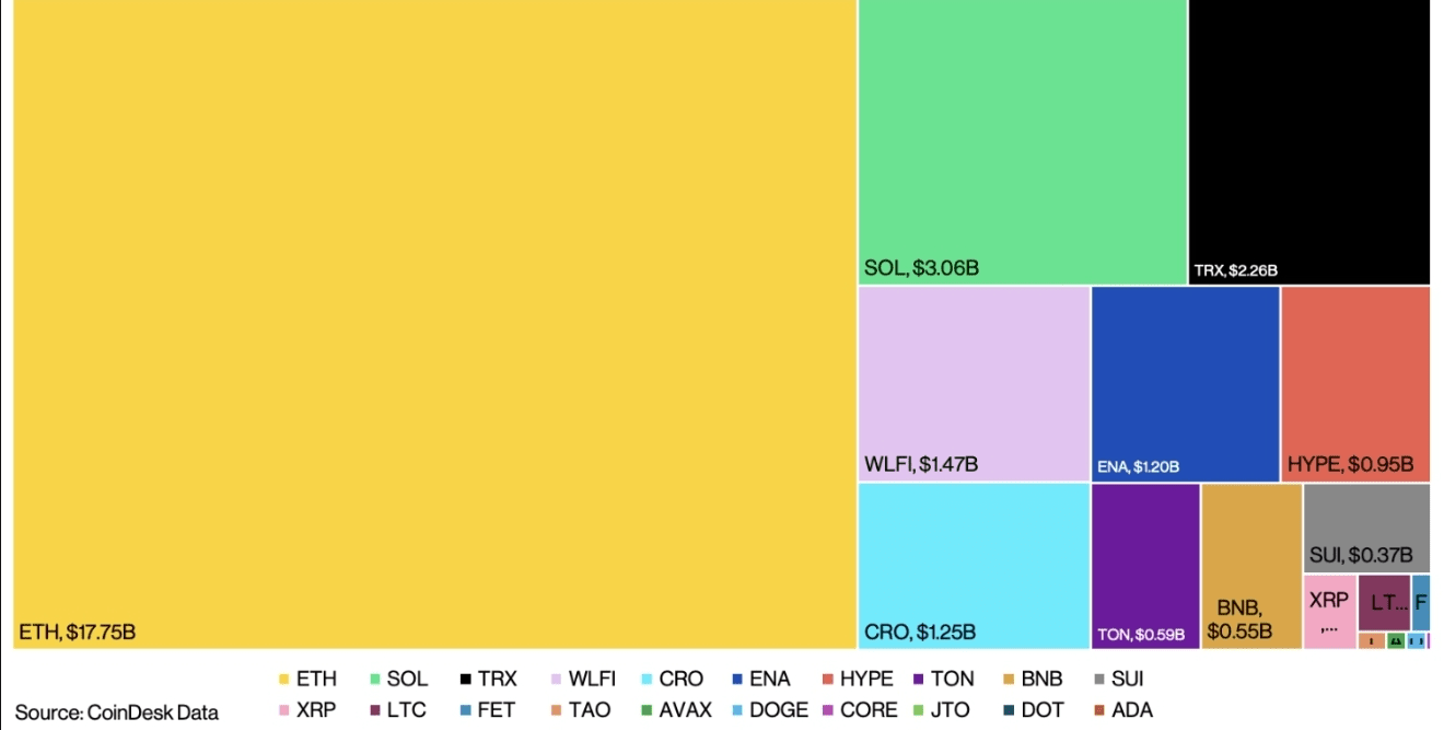 但这次,比特币分享了聚光灯。以太坊在第三季度上涨66.7%,达到了接近$5,000的新高。这一走势主要由国债积累和ETF资金流入推动,但未来的收益可能取决于11月的Fusaka升级,旨在改善可扩展性和网络效率。如果成功,它可能会强化以太坊作为链上金融活动基础的角色,特别是在“低风险”的去中心化金融(DeFi)中。