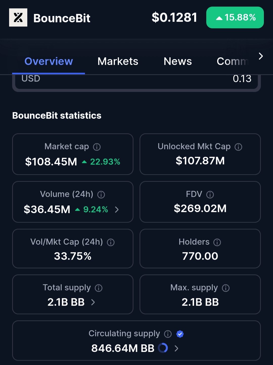 查看数字:$BB 的交易价格为 $0.1281,在过去 24 小时内上涨了 15.88% — 这不是某种拉升和抛售的迷因币走势,而是由实际产品吸引力推动的有机增长。市值为 $108.45M,在同一时期的交易量为 $36.45M — 这意味着 33.75% 的交易量与市值比率。这种流动性不是偶然发生的。它发生在实际使用平台、质押、重新质押并通过 BounceBit Prime 赚取收益的人们身上。