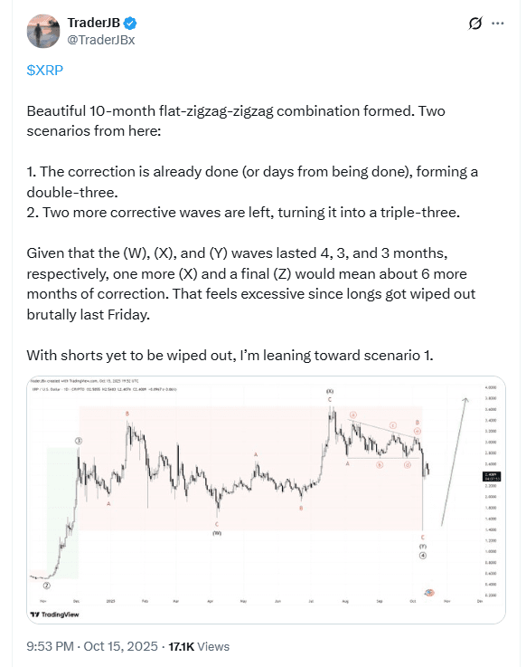 随着挣扎的持续,市场分析师 TraderJB 最近强调了该代币可能采取的两个方向。根据他的说法,XRP 要么在结束一个长期的修正阶段,要么在朝着一个可能持续到明年的扩展整合。