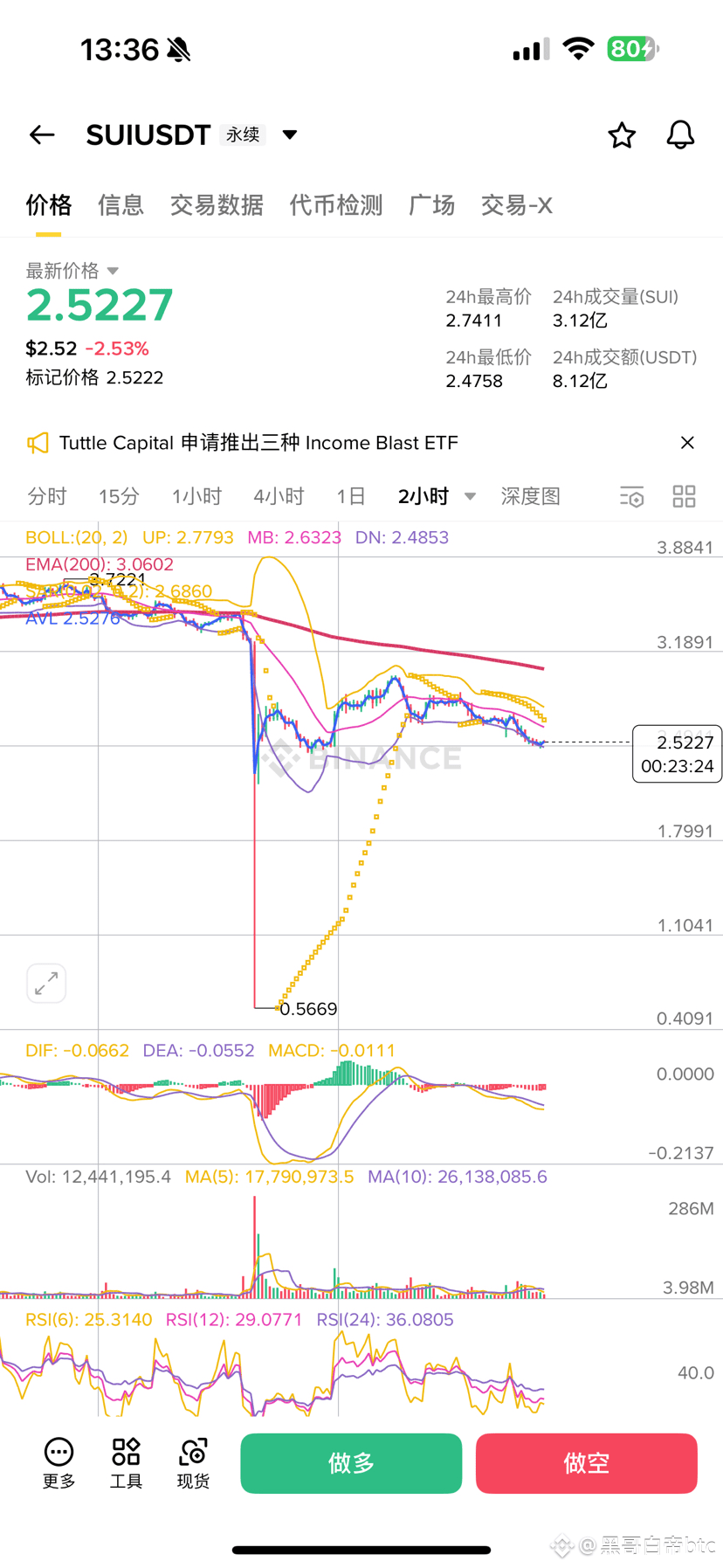 准备500u,买空sui,进场2.55上下,着急的以下都可进,强平放2.695,杠杆开最大,价格跌到了2.335开同仓位多对冲吃回调,接近2.42附近平对冲多,继续下跌,后面再说,这样的话500u本金能到1200u,继续下跌的话,本金就有了1800u左右,亏损也就亏500u,这是不滚仓版