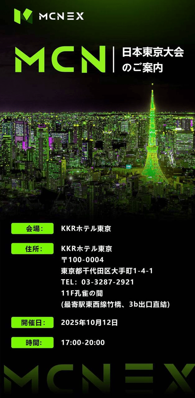 2025 年 10 月 12 日,由 MCN 集团主办的线下盛会 ——MCN日本东京大会在 KKR ホテル東京盛大举行,活动于17:00 - 20:00期间顺利开展,吸引了众多行业人士与投资者踊跃参与。