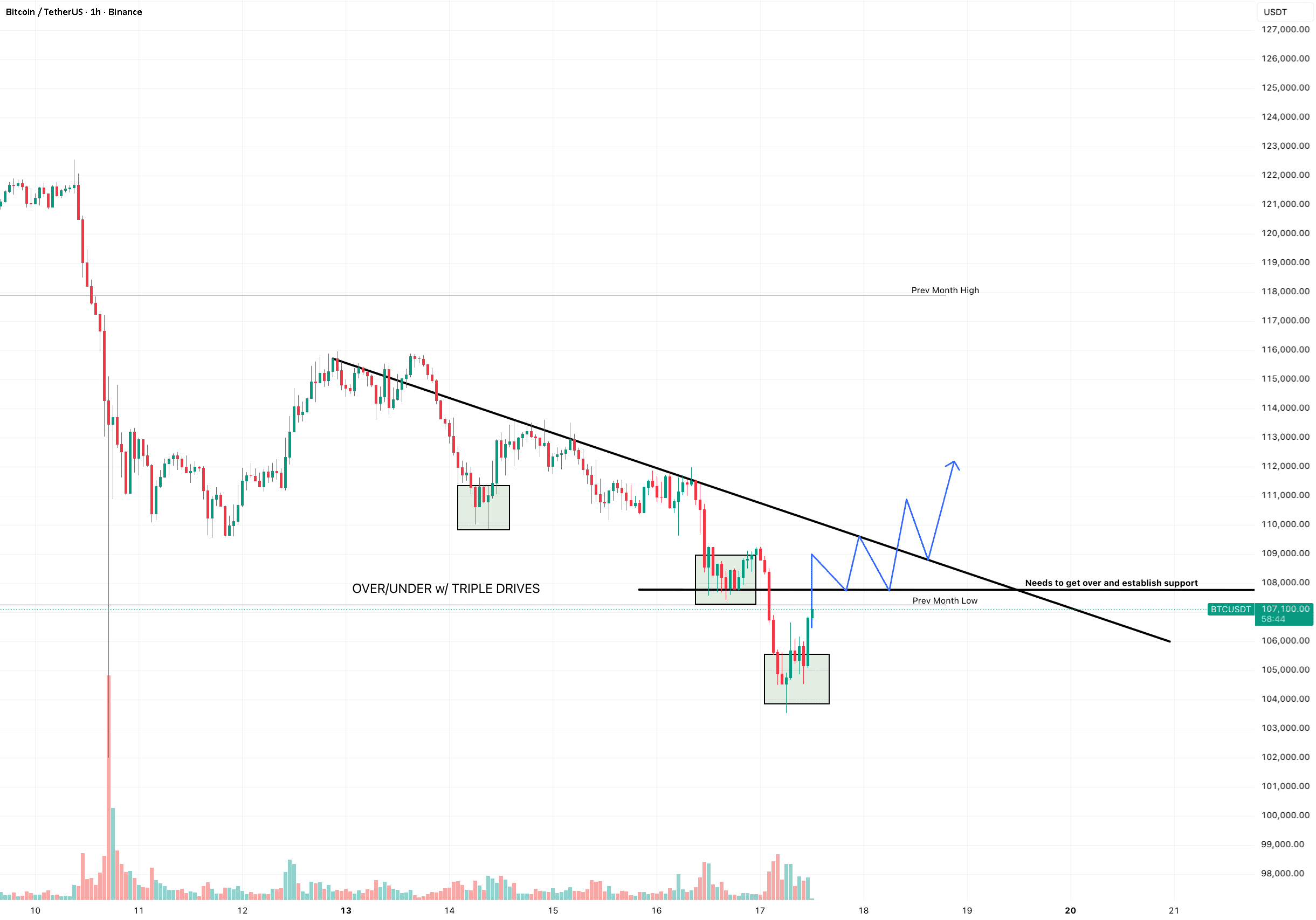 在之前最低点(约104K)下方的干净收盘将取消这一看涨论点,并为102K美元铺平道路。