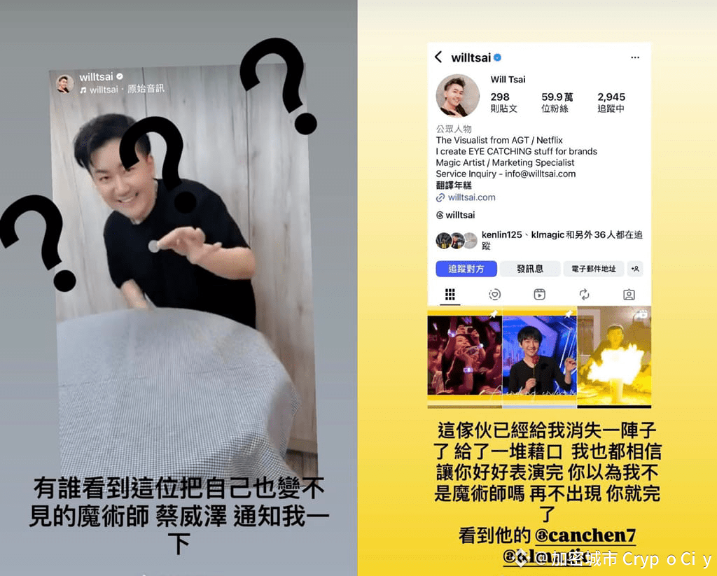 亞洲天王周杰倫近日罕見在 Instagram 限時動態發文,公開「尋人」魔術師好友蔡威澤,並以一句「你以為我不是魔術師嗎?再不出現,你就完了」掀起網路熱議。據《鏡週刊》報導,兩人疑因涉及上億台幣的比特幣投資糾紛而決裂。