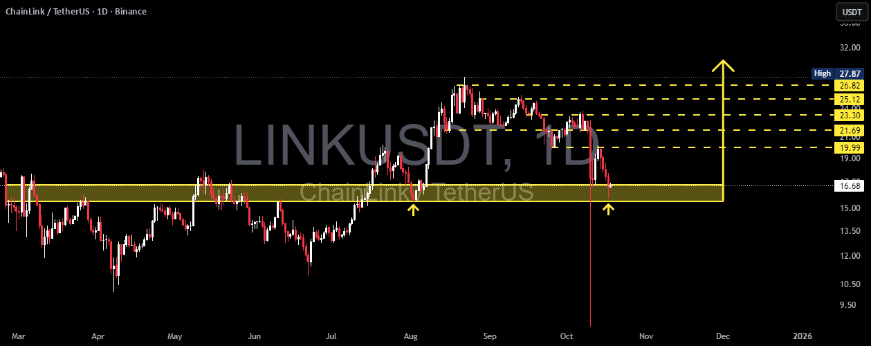 这个区域并非随机——它正是市场曾经发起重大反弹的相同水平,推动 LINK 达到 $27.87。