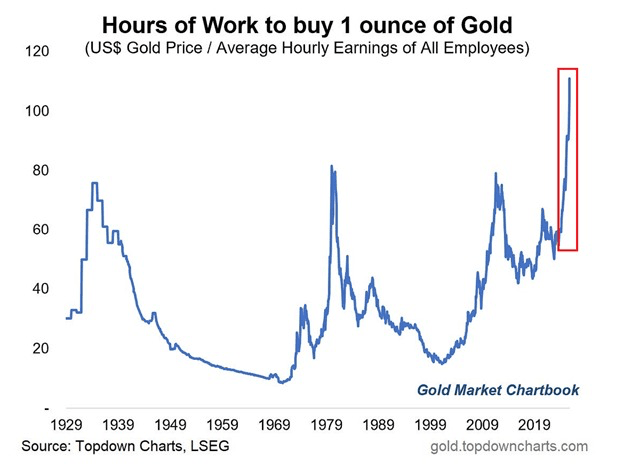 总之,黄金进入了一个历史上相对于工资而言非常昂贵的阶段,购买一盎司黄金需要116小时的劳动——这是至少100年来未曾见过的水平。这一戏剧性的变化反映了金属的持久吸引力和收入增长在跟上资产通货膨胀方面的局限性。投资者、政策制定者和普通工人都被迫在一个黄金仍然是终极价值储存的环境中导航,但这个价值储存变得越来越理想化而非普遍可达。