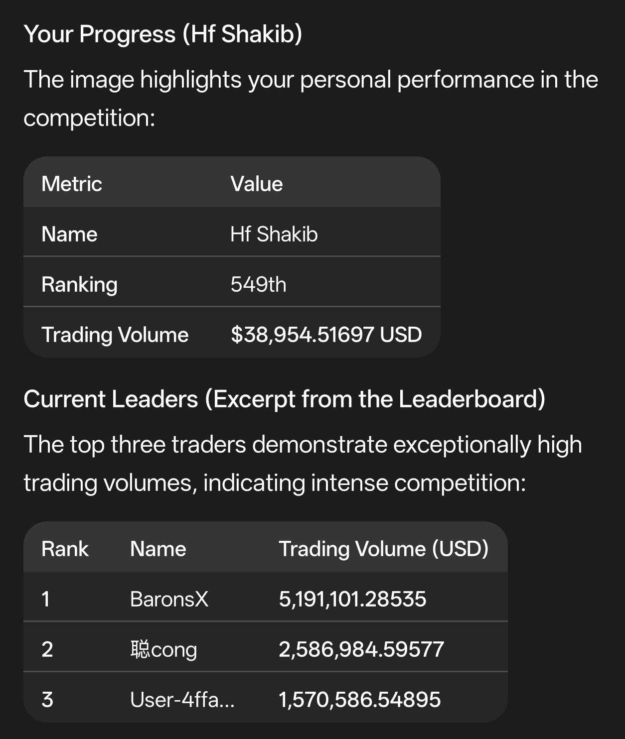 * 排行榜: 它跟踪每个参与者产生的总交易量 (USD)。较高的交易量将导致更好的排名和更大的潜在奖励。