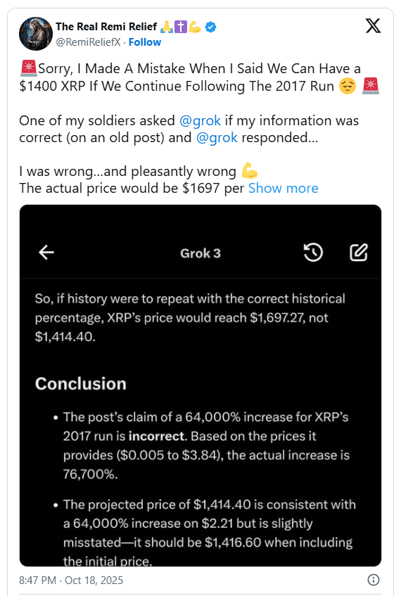 Grok 的回应,如 The Real Remi Relief 在 X 上分享的那样,纠正了这个数字,揭示如果今天重复相同的历史百分比增长,XRP 的准确预测实际上将是 $1,697。