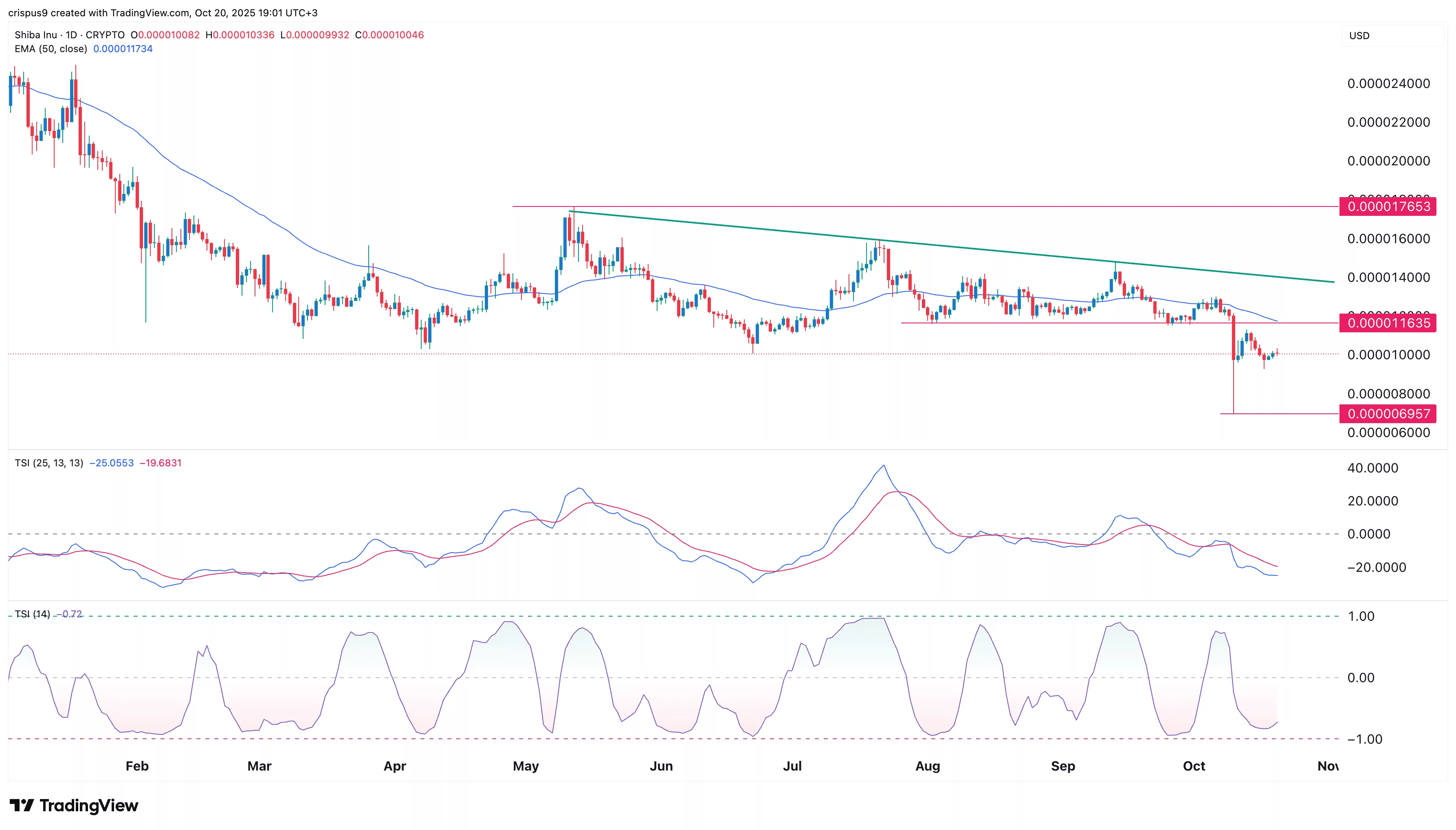 尽管SHIB在过去三天中略有回升,但真实强度指数(TSI)仍低于零线,这表明趋势动能疲弱。
