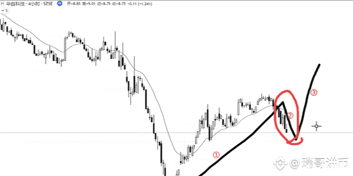 假如我们打开4小时图(图12),他认为1号线这段反弹现在还没有走完,还要再向上走一段,在这个背景下,他要去做2号线红色圈住的这段下跌的反转。所以他死死地盯着2号线的位置,寻找做多的机会!