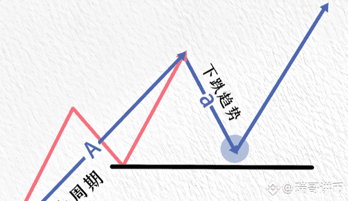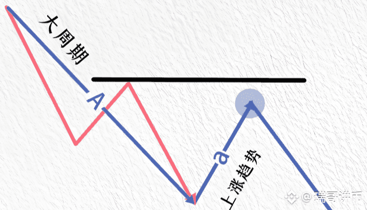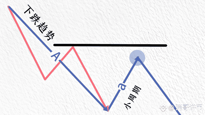 那这里的大A,就是相对于小a这个小周期来讲,那个较大周期级别里面的上涨趋势(图4);而这里的小a,就是相对于大A这个大周期来讲,那个较小级别里面的下跌趋势(图5)。因为如果我们跑到更小周期里去观察,发现小a这个小周期里面,也一定是有更低的低点、更低的高点。#国产概念币集体爆发