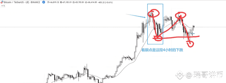我们再来看一个BTC的案例,这明明是一段上涨趋势,但我们也确实听到了,张三为什么明明靠做空赚到了钱呢? 那有可能张三他的着眼点,根本就不是日线级别的这段大的上涨,而是4小时的这段下跌(蓝色方框)(图14)。
