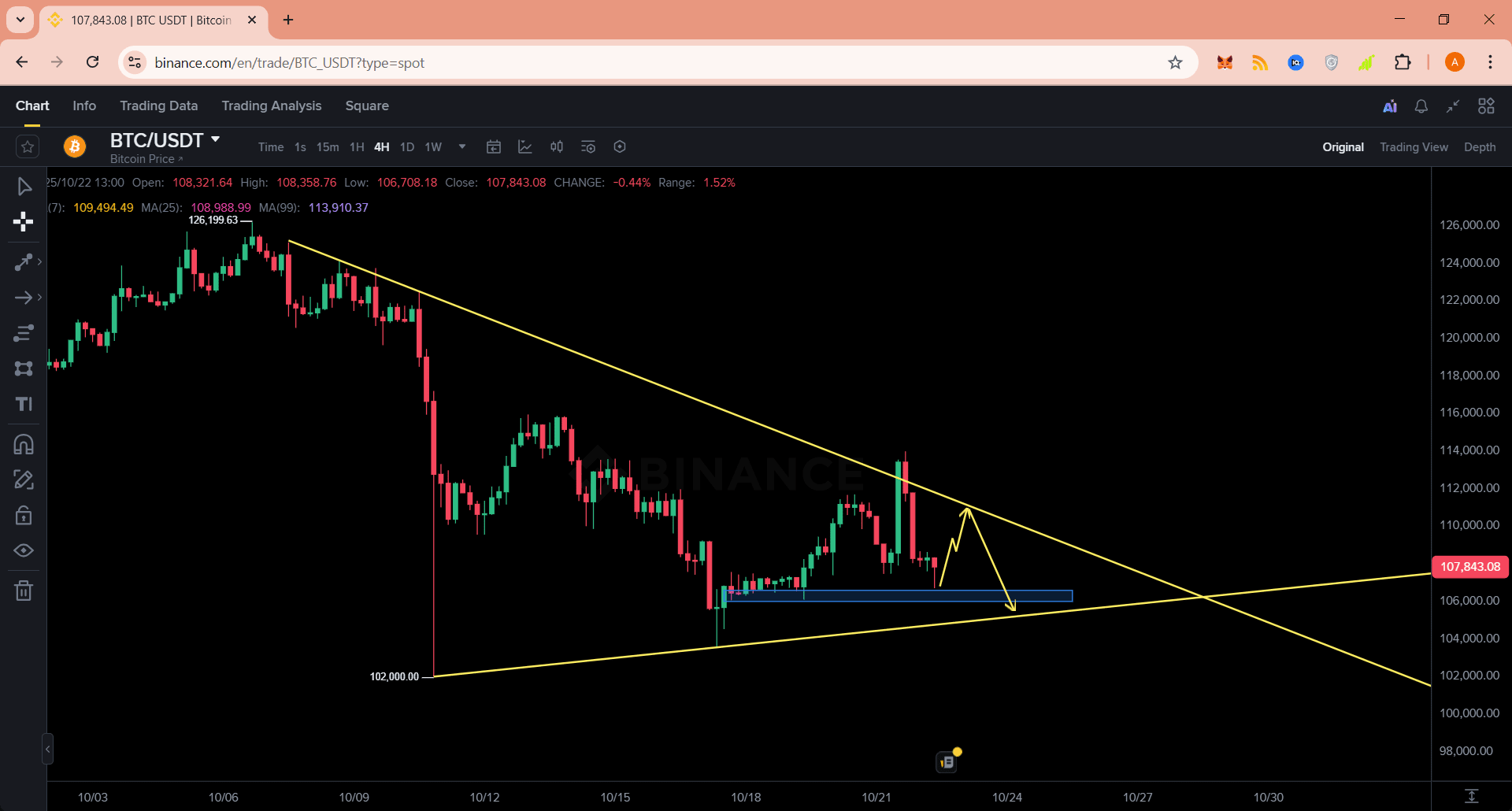 $BTC 一直在一个下降三角形内收缩,顶部的更低高点向下施压,强大的底部坐落在$102,000 👉 $104,000附近。