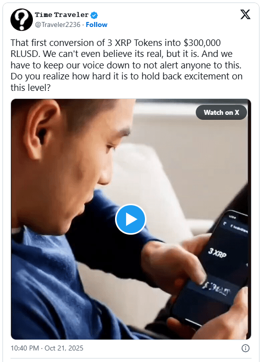 在 Time Traveler 分享的短视频中,可以看到一名男子在执行 XRP 和 RLUSD 之间的交换后努力控制自己的喜悦。他的声音在情感中几乎不稳,反映出他所声称目睹的事情的完全不敢相信,即仅仅三枚 XRP 代币转化为巨额的 300,000 RLUSD。