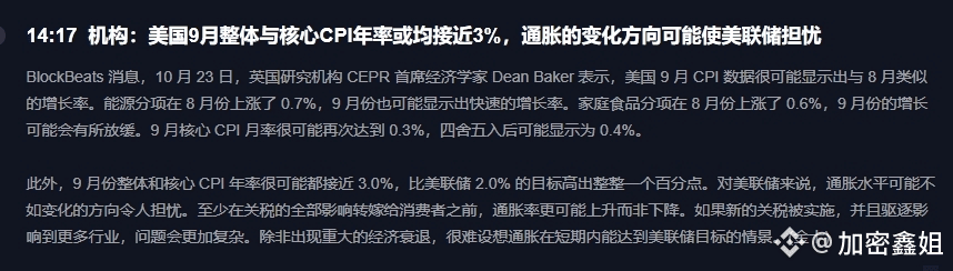 美国9月CPI数据爆料,整体和核心通胀年率可能都接近3%,比美联储2%的目标高出一大截。简单说,就是物价涨得猛,美联储可能更担心通胀压不住,短期内降息没戏,甚至可能更鹰派。这对风险资产像BTC不是好事,因为高利率会让资金流向债市等稳妥地方,币市容易承压。但反过来想,BTC有时也被当通胀对冲工具,万一通胀持续,部分资金可能跑来找避风港,所以别一味看空。关键看美联储后续表态,现在市场在观望。