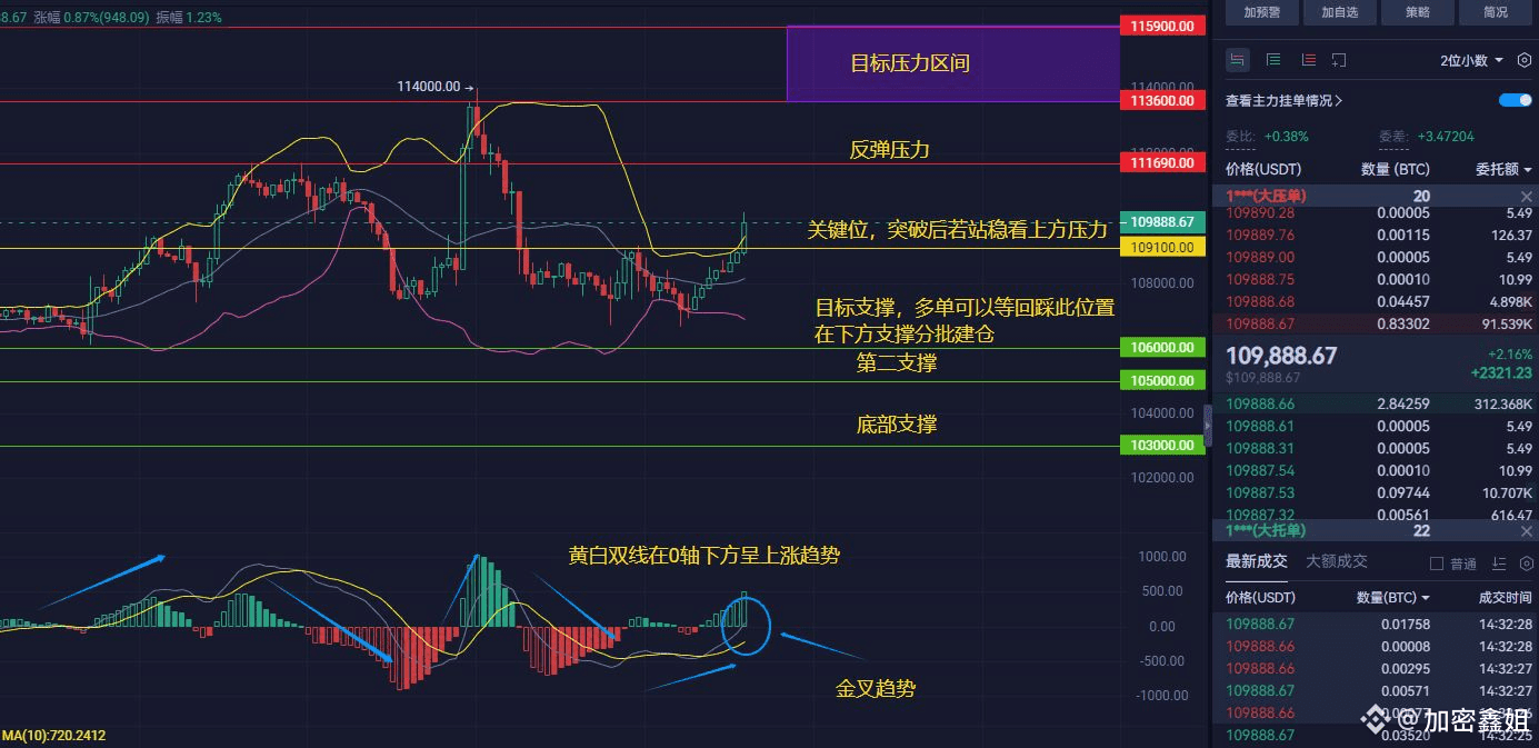 BTC 1小时K线显示,价格在109,888美元附近挣扎,但技术指标有亮点:黄白双线在0轴下方出现金叉趋势,这是个短期看涨信号。支撑压力位也很清楚,底部支撑103000美元,第二支撑106000美元,目标支撑在108000-109000美元;上方反弹压力111690美元,关键位109889.76美元,突破后目标压力区间是113600-115900美元。买卖单显示委比小幅正数,说明多头略占优,但量能不大,得警惕假突破。