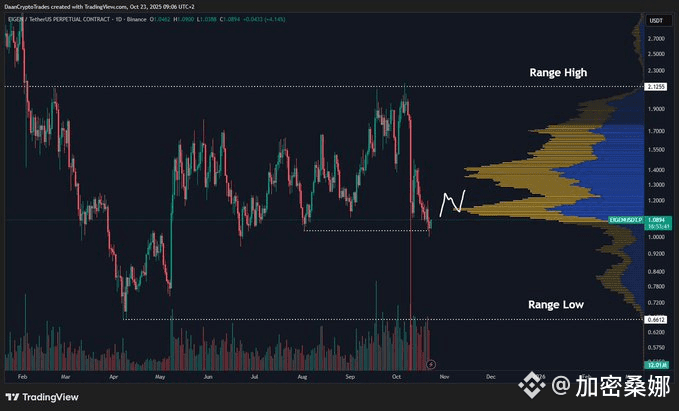 EIGEN 回到区间中间晃悠了,想看出它行不行,就盯 1.15 美元 —— 突破这个价,才算短期有实力。