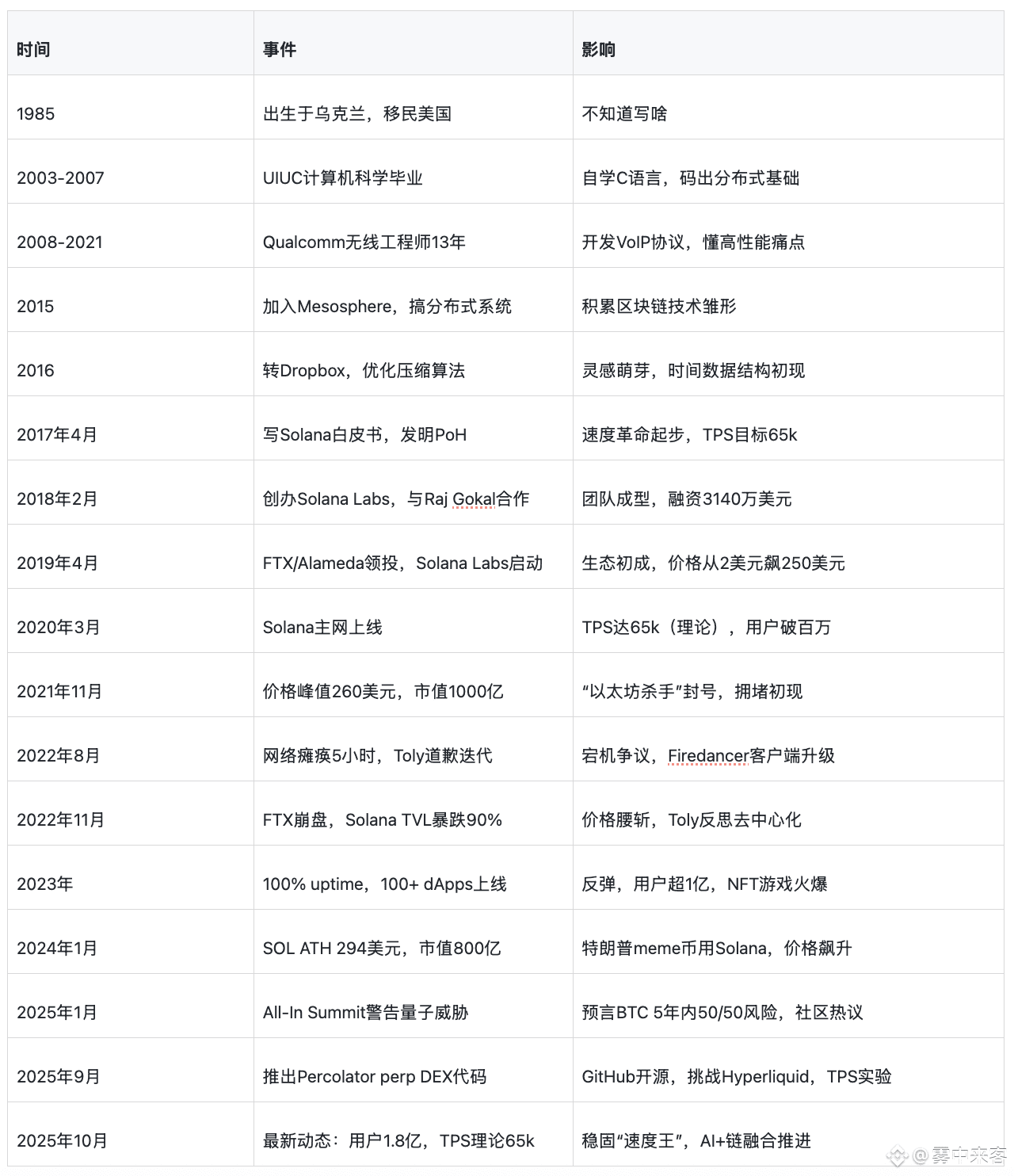1985年,Anatoly Yakovenko(简称Toly)出生于乌克兰,家境普通(也是平民出身)。童年移民美国,高中熬夜自学C语言,梦想写出“改变世界的代码”。谁能想到,这个“普通码农”会敲出Solana——全球用户1.8亿、理论TPS达65k(实际1k-4k)的“速度之王”?