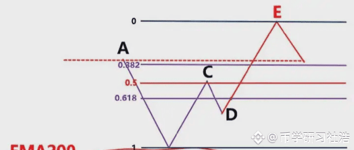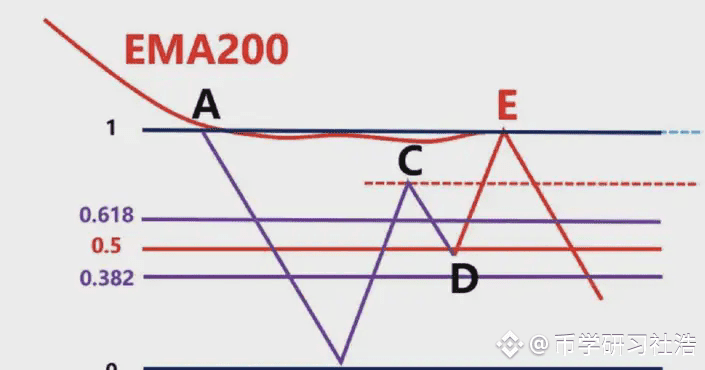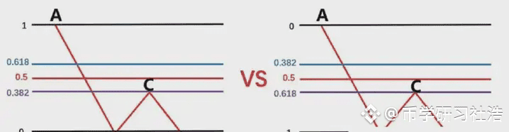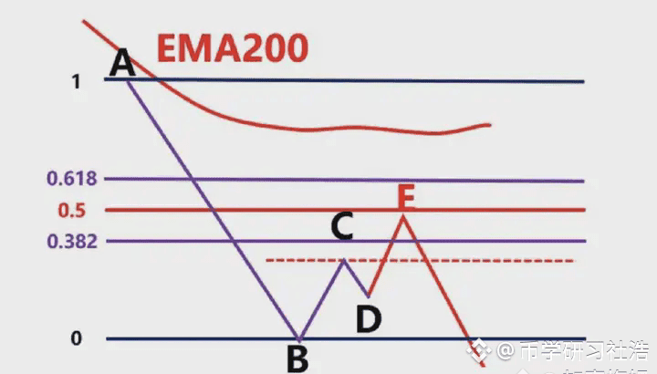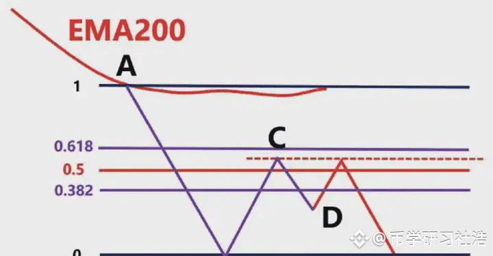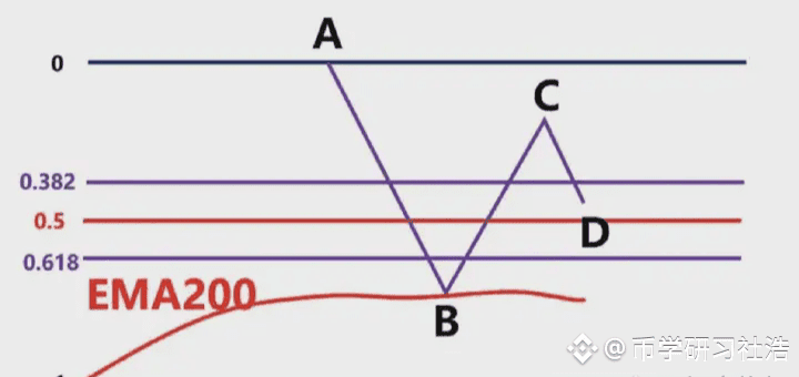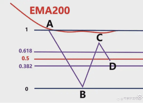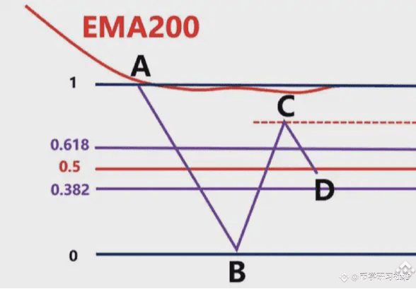 首先我们不能以BC为波段高低点直接连接,然后去画斐波那契。此时价格从高点C,一直往下跌到D点,那在D点这个位置,有可能下跌,也有可能上涨,我们先考虑假设下跌。那么我们就要根据,前波段高点A和前波段低点画斐波那契,然后观察B点的区域是否为这个斐波那契回测的0.382-0.618的位置区域。