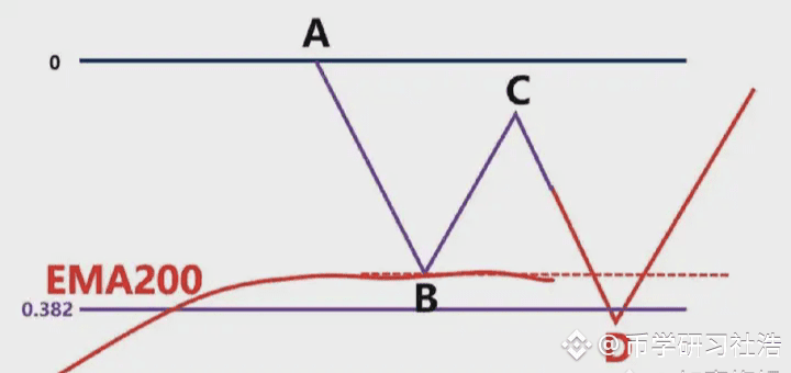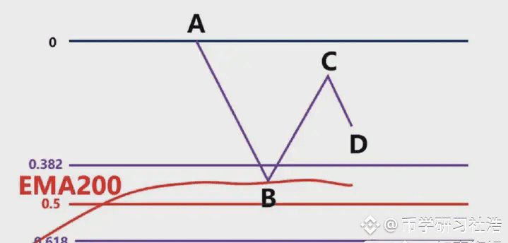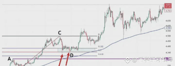首先我们不能以BC为波段高低点直接连接,然后去画斐波那契。此时价格从高点C,一直跌到D点,那在D点这个位置,一样有可能上涨,也有可能下跌,我们先考虑假设上涨,我们该怎么画斐波那契区域呢?这时候我们就要根据,前波段高点A和前波段低点B画斐波那契区域,然后观察C点的位置是否为这个斐波那契回测的0.382-0.618的位置区域。如果C的位置是在0.382-0.618的反弹区域当中,如图2.4-33所示,