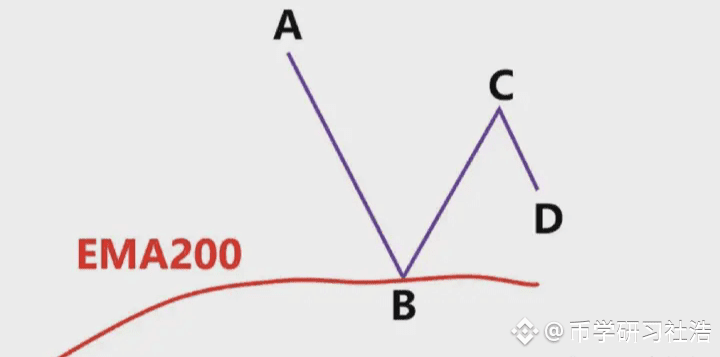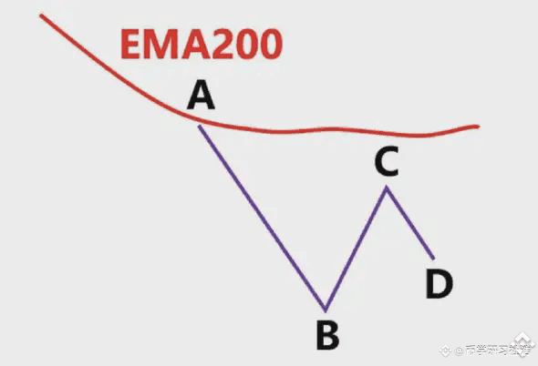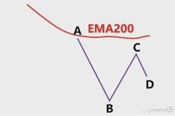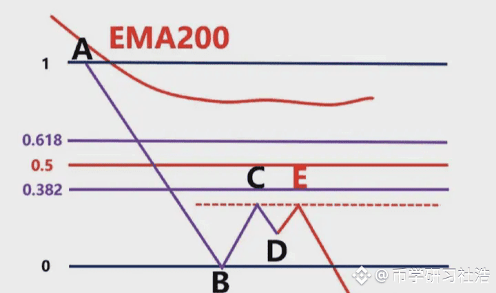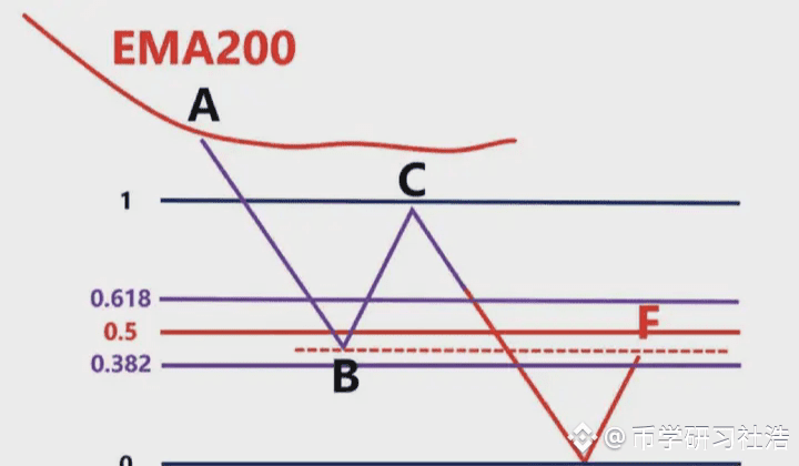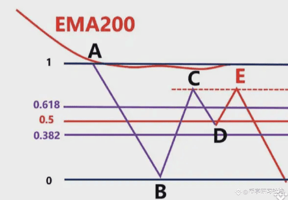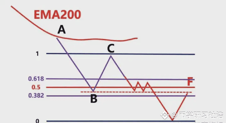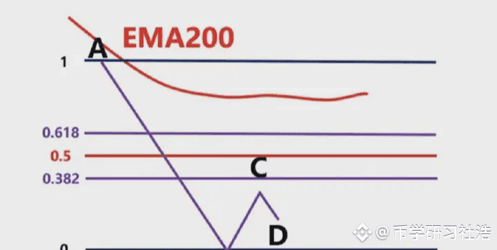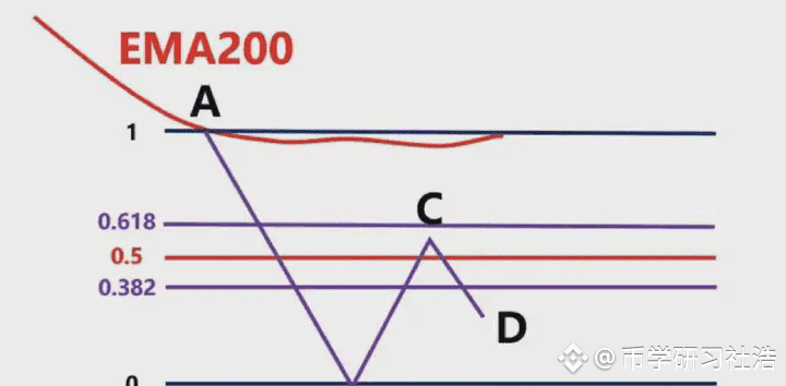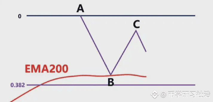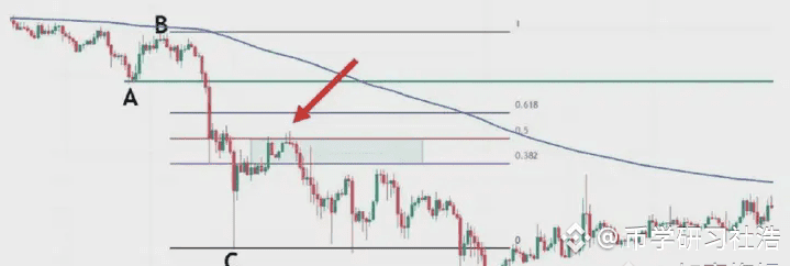 图中蓝色的线就是EMA200,我们看到低点A和高点B,此时价格在EMA200下面,我们只做空,不做多,我们以低点A画一条绿色水平支撑线。我们看到后续价格直接跌破A到达低点C,我们就以高点B和低点C画出斐波那契区域,然后观察价格回到0.382-0.618区域价格的表现,图上浅绿色区域。