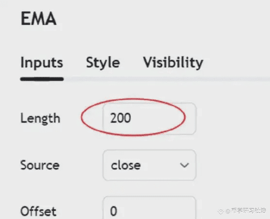 这时候很简单,我们添加EMA指标,将参数修改为200即可,如图2.4-18所示,就是表示EMA200的设置,