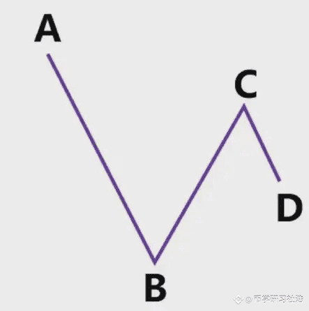 我们可以看到,价格从高点A下跌到低点B,然后上涨到高点C,C没有突破前高A,这时候价格到了D的位置,我们应该怎么画呢?是以AB高低点画,还是以BC高低点画?