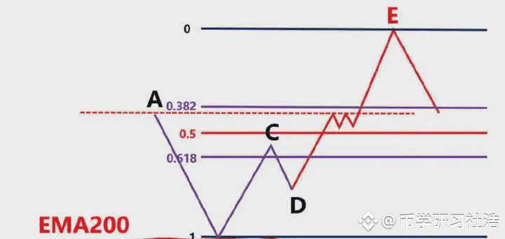 还有可能突破阻力区域到E位置,形成BC和DE等距,且刚好E反弹的位置到了斐波那契的0.382-0.618区域,然后继续下跌,如图2.4-37所示,