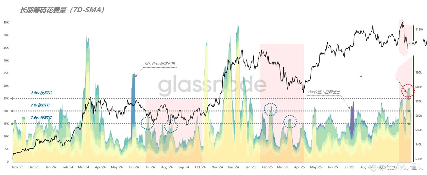 从下图来看,蓝色与紫色的柱体分别对应了2024年6月Mt.Gox代币转移及2025年7月约8万枚“远古筹码”的集中出售。这些交易使得长期筹码的派发量在短期内显著上升。