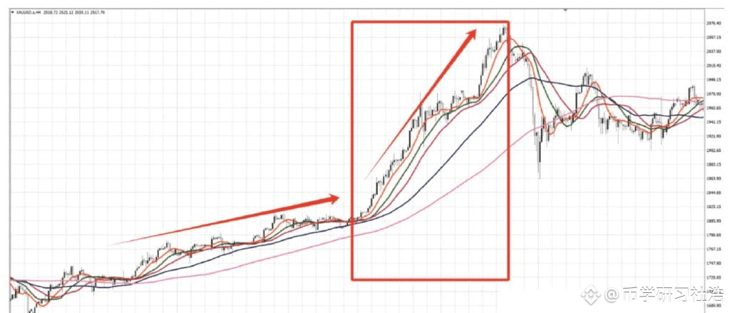 举个最直观的例子,强势上涨中有个非常经典的形态叫多头排列,均线从短周期到长周期,自上而下很均匀的分布,没有出现均线交叉。