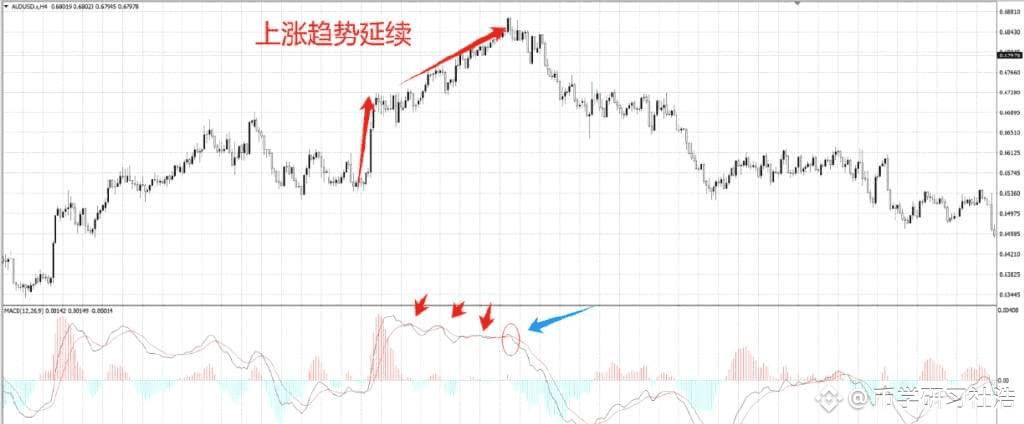 一般来说,这个过程中MACD会在高位反复粘合发散,只要这个过程没有结束,说明趋势延续。但是一旦高位死叉,前期背离压力释放,行情将直接开启下跌行情。