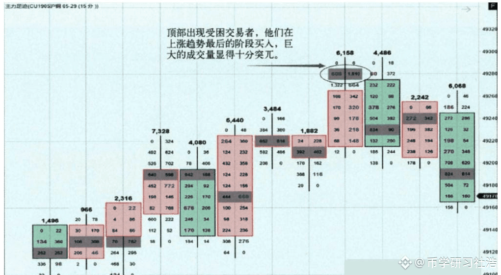 另外,当我们在订单流工具中发现,如果一根在相对高位的K线,其顶部只有多单而没有空单,也通常是见顶的信号,因为我们订单成交机制是一个空单一个多单一一对应,当缺乏空单时,说明空方认为价格无法继续走高,所以不会选择在更高的位置做空。