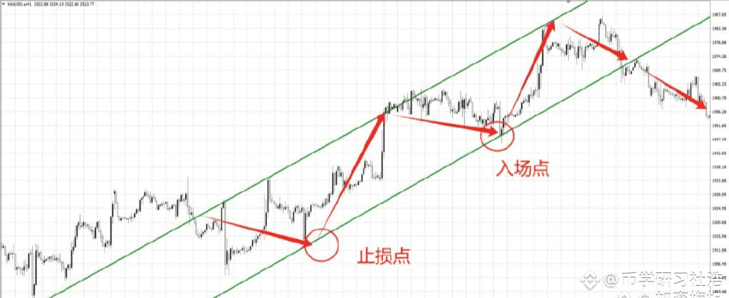 这是一个次级上涨形态,唯一的问题是,这个过程中永远在进行方向选择,随时可能会破位转向。所以,在一个中等上涨中,我们一般在触及通道线下沿的位置入场,并在前一个低点设置止损。