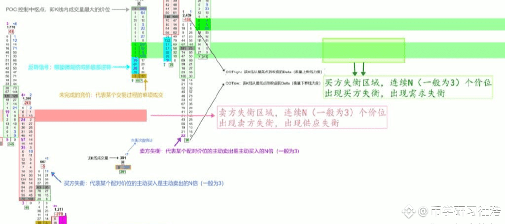 在订单流工具中,会实时统计每一根K线中买单/卖单的比例,如果某一个价位上买单/卖单>3或者卖单/买单>3,就是失衡,前者是买方失衡,说明市场做多情绪旺盛;当连续三次出现买方失衡,就构成了失衡堆积,说明买方在放量上攻。