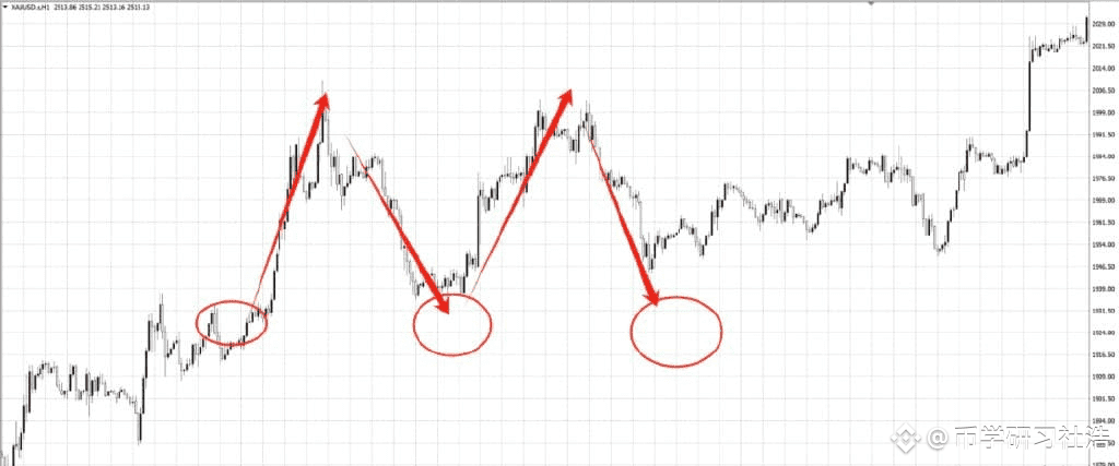 在上涨行情中,当一个顶部信号出现时,接下来的反转速度将决定趋势强度,同样也包括三类,强势反向角度、中等反向角度和弱势反向角度。