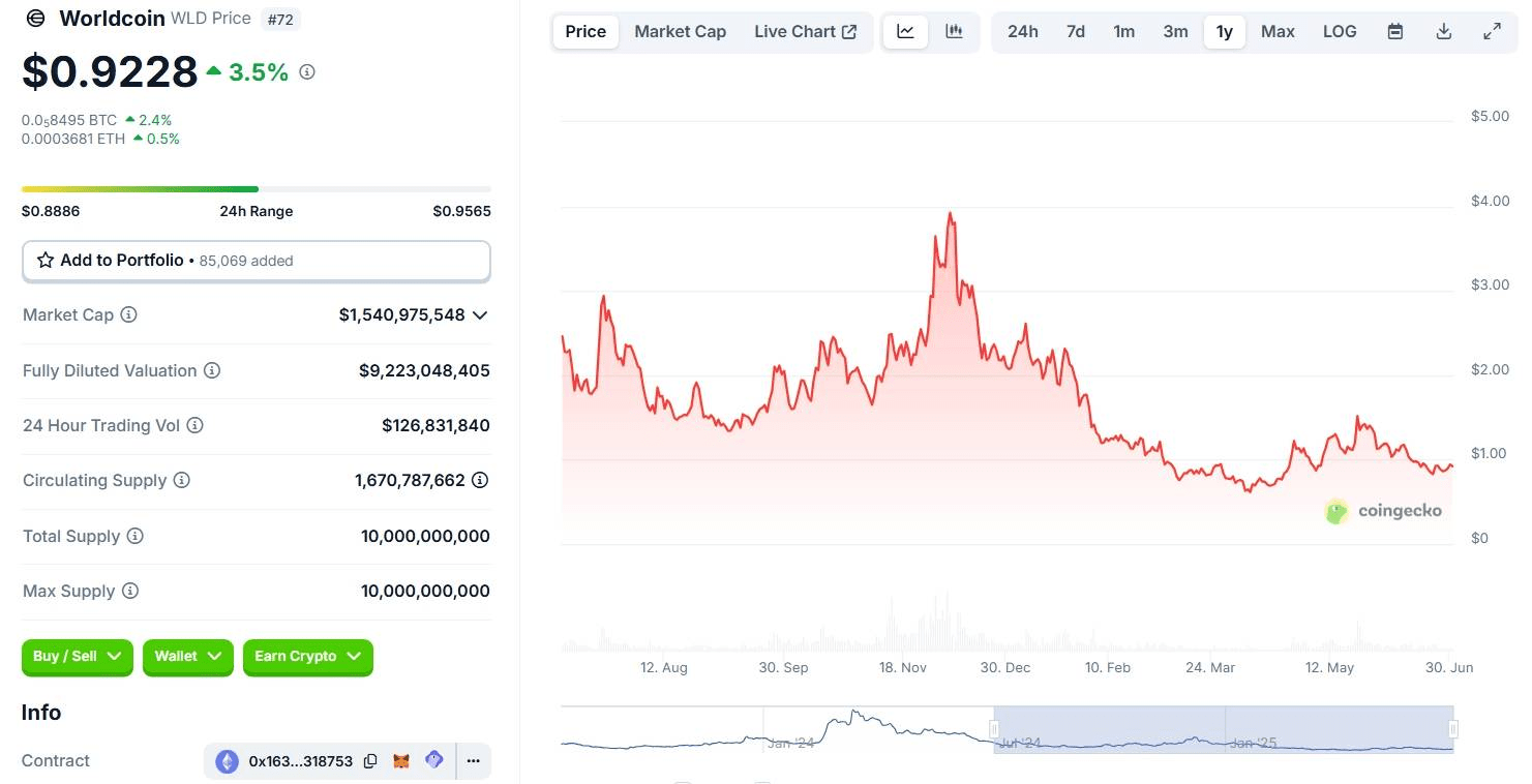 尽管WLD代币价格强劲上涨,但在市场上仍面临压力,交易价格低于关键技术阻力位。过去24小时内,WLD代币上涨约3.5%,交易价格约0.92美元/枚。