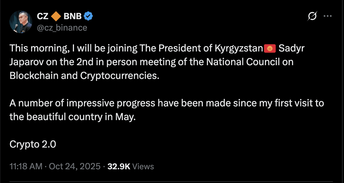 币安创始人、前CEO赵长鹏(CZ)于 X 平台宣布将与吉尔吉斯斯坦总统 Sadyr Japarov 共同参加国家区块链和加密委员会第二次现场会议。