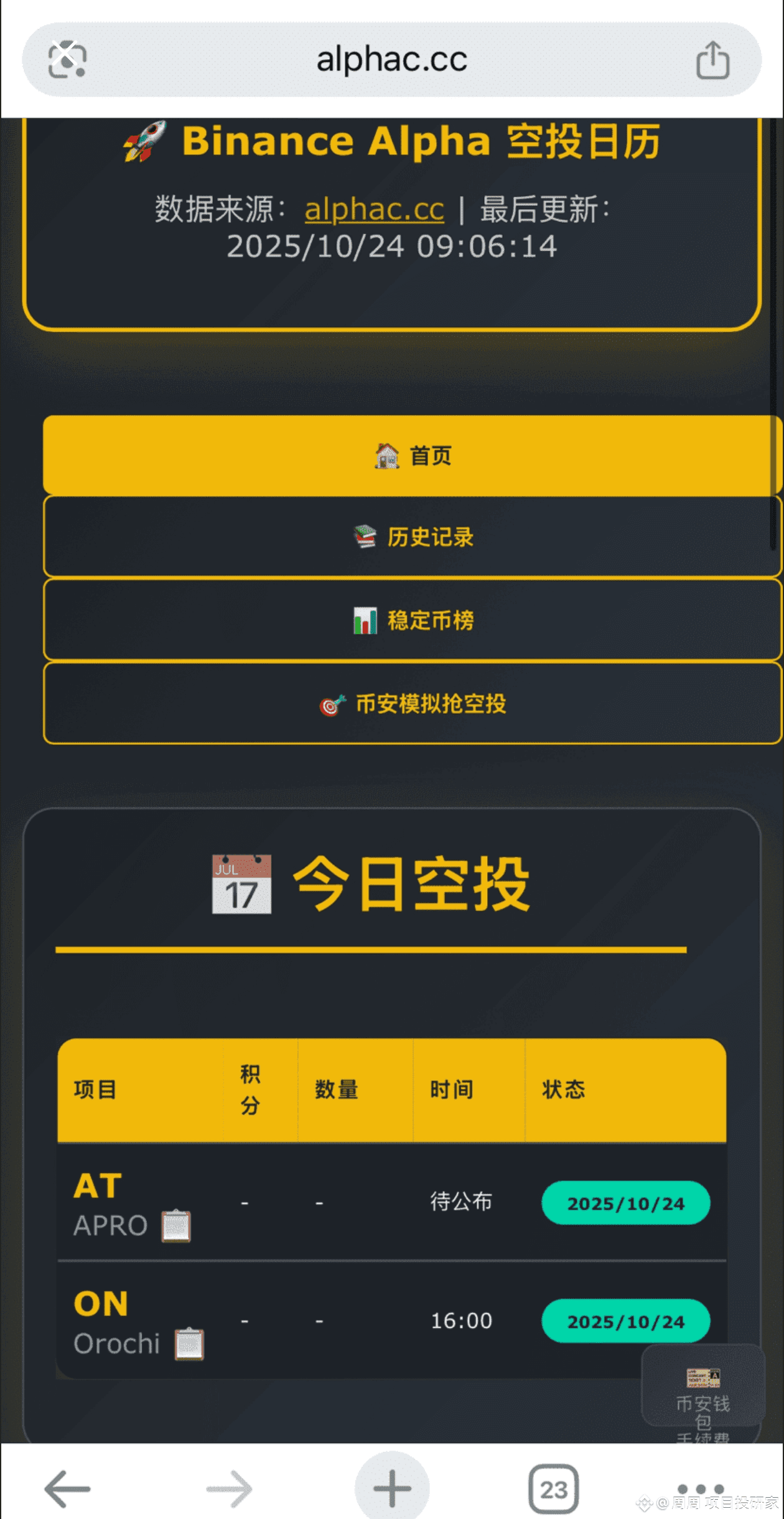各位币圈用户注意!币安Alpha板块今日(10月24日)迎来双空投机会,两大潜力项目同步上线,手速直接决定收益,堪称周末前最后一波零风险红利,务必提前做好准备,错过再等周期!