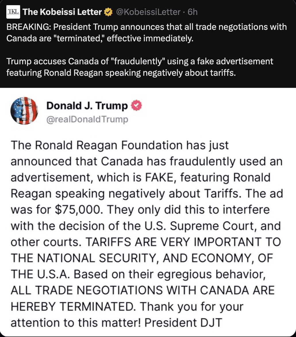 在2025年10月23日东部时间22:39,特朗普总统通过真相社交平台终止了所有美加贸易谈判。触发因素:安大略省7500万美元的广告活动,展示了罗纳德·里根1987年真实的广播演讲,警告有关关税的问题。
