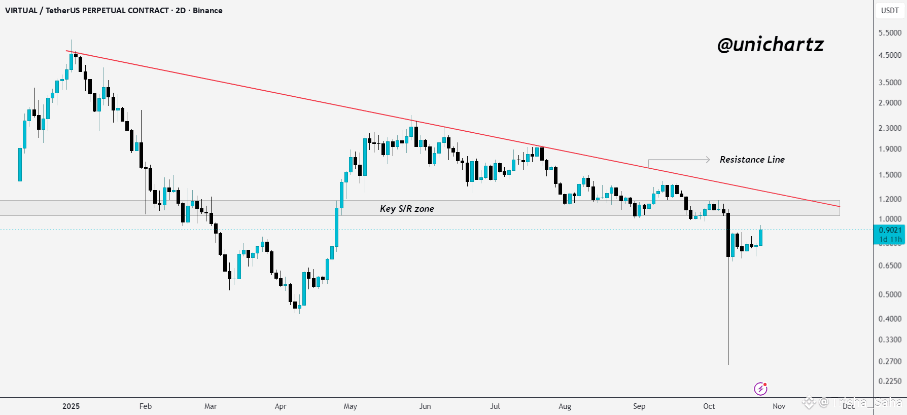 VIRTUAL has rebounded strongly from the bottom after the recent drop but is still trading below the resistance zone, which once acted as key support.