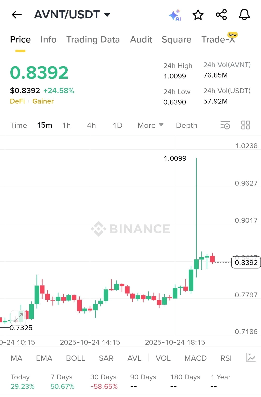 $AVNT 刚刚爆发出强大的力量——从0.73区间一路突破到1.00标记,然后在0.83附近冷却下来。我看到强劲的后续成交量,这意味着买家仍然活跃并捍卫关键支撑。15分钟图表显示,在一次急剧的冲动蜡烛之后,完美的动量延续,确认需求尚未减弱。