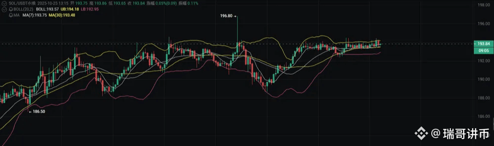 日线级别:10月24日出现长上影线(197高点),随后价格回落至193.5附近,显示195-197区域存在强抛压。10月23日大阳线(180→193)后连续两日回调,形成短期顶部结构。1小时级别:当前价格在194.5-192.5区间震荡,10月25日09:00曾测试194.49后迅速回落,形成看跌pinbar。