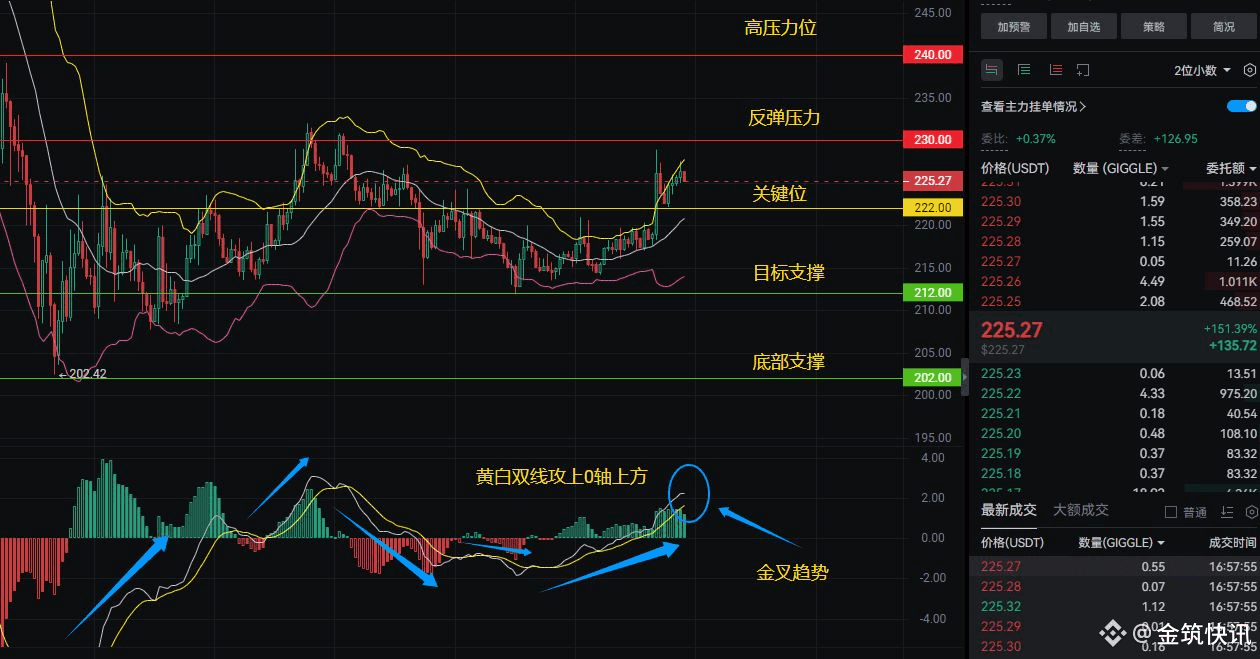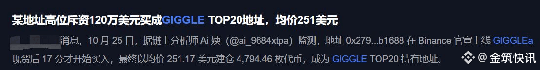 老铁们,今天咱们来聊聊GIGGLE这玩意儿,它最近可是币圈的热点!先看最新价:225美金左右。这币刚在Binance上线,就闹出一波血腥行情——有消息说,某个神秘地址高位砸了120万美金,均价251美金买成了TOP20大户。听着牛逼不?但金筑我告诉你,这可能是“割韭菜”的陷阱!为啥?你想想,上线才17分钟就冲进去,价格已经炒高了,这不是明摆着让散户接盘吗?消息面看着热闹,但小心被“埋雷”!