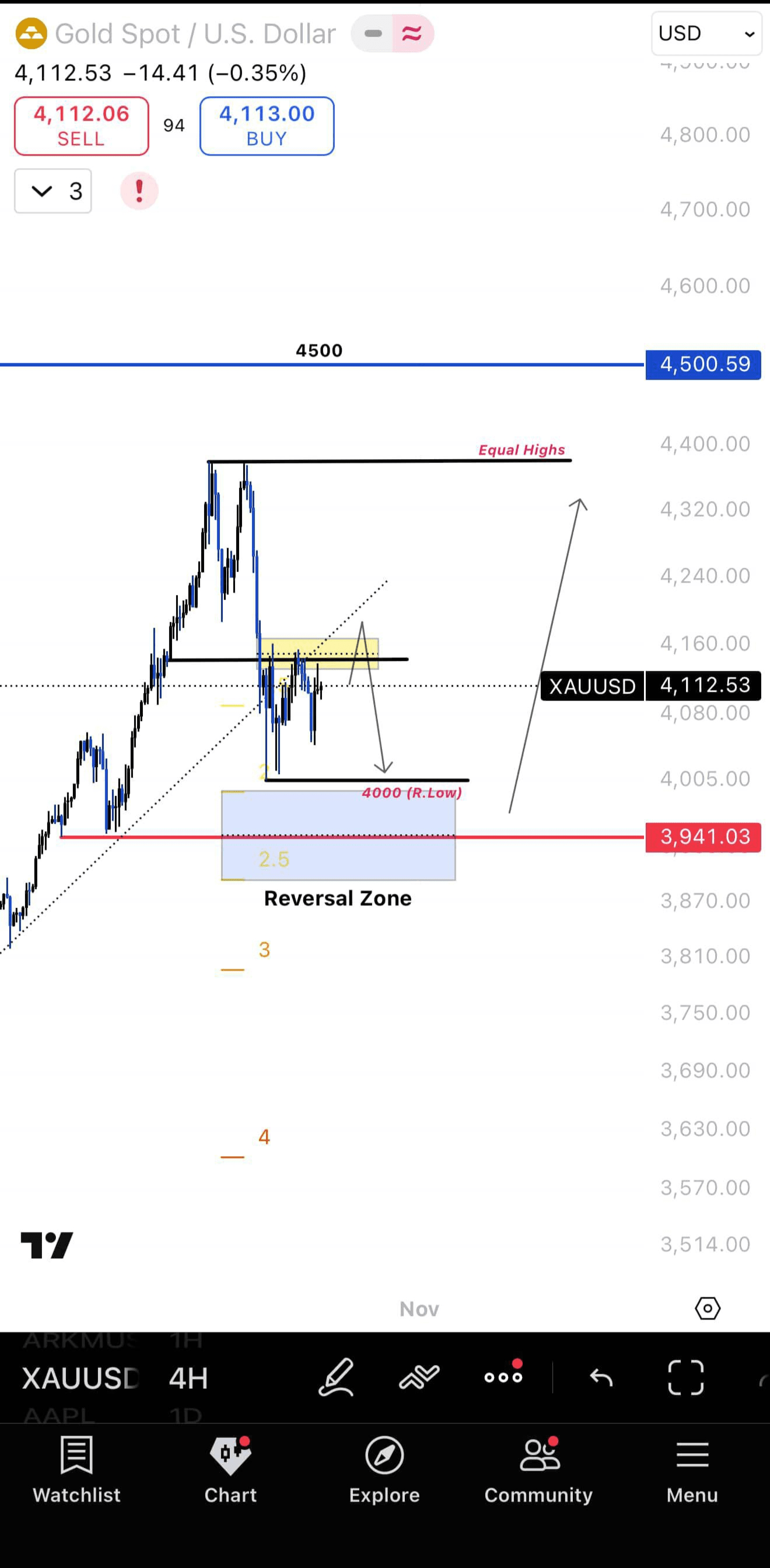 黄金现货/美元(XAUUSD)图表正在经历一个关键的整合点,此前从近期高点出现了剧烈修正。价格目前徘徊在$4,112.53,表明这是4小时时间框架内交易者的决定性时刻。