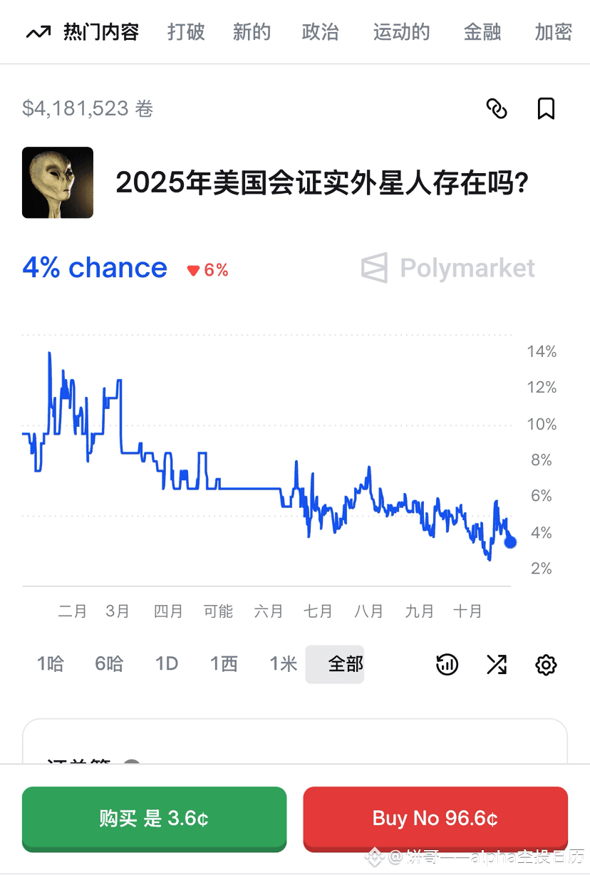 参与策略很灵活:小玩就少投点,多试几个项目;想多赚就盯准稳的,比如“2025年前美国发现外星人吗?”选“No”,近俩月能赚4%,年化直接20%!既能赚收益,又能博取空投,这不香吗?大部分受过九年义务教育的人都不觉得的,未来两个月会发现外星人。