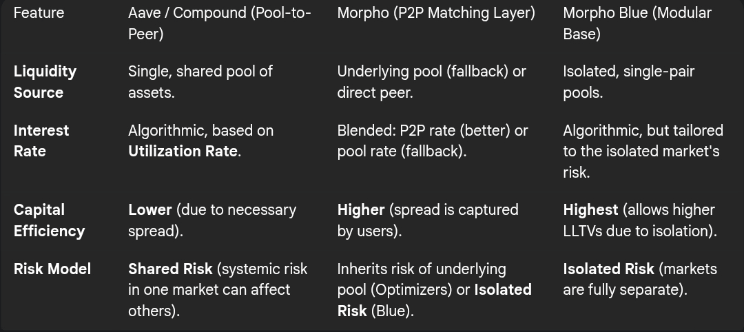 Aave和Compound使用池对池(P2P-P)架构,而Morpho采用了一个对等(P2P)匹配层,位于池的顶部或作为更高效的替代方案。