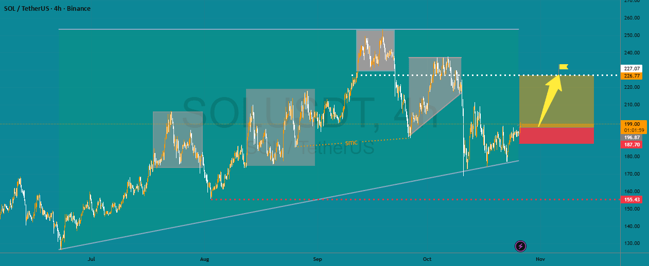 市场显示出清晰的上升趋势结构,持续形成更高的低点(HLs)沿着上升趋势线 📈。