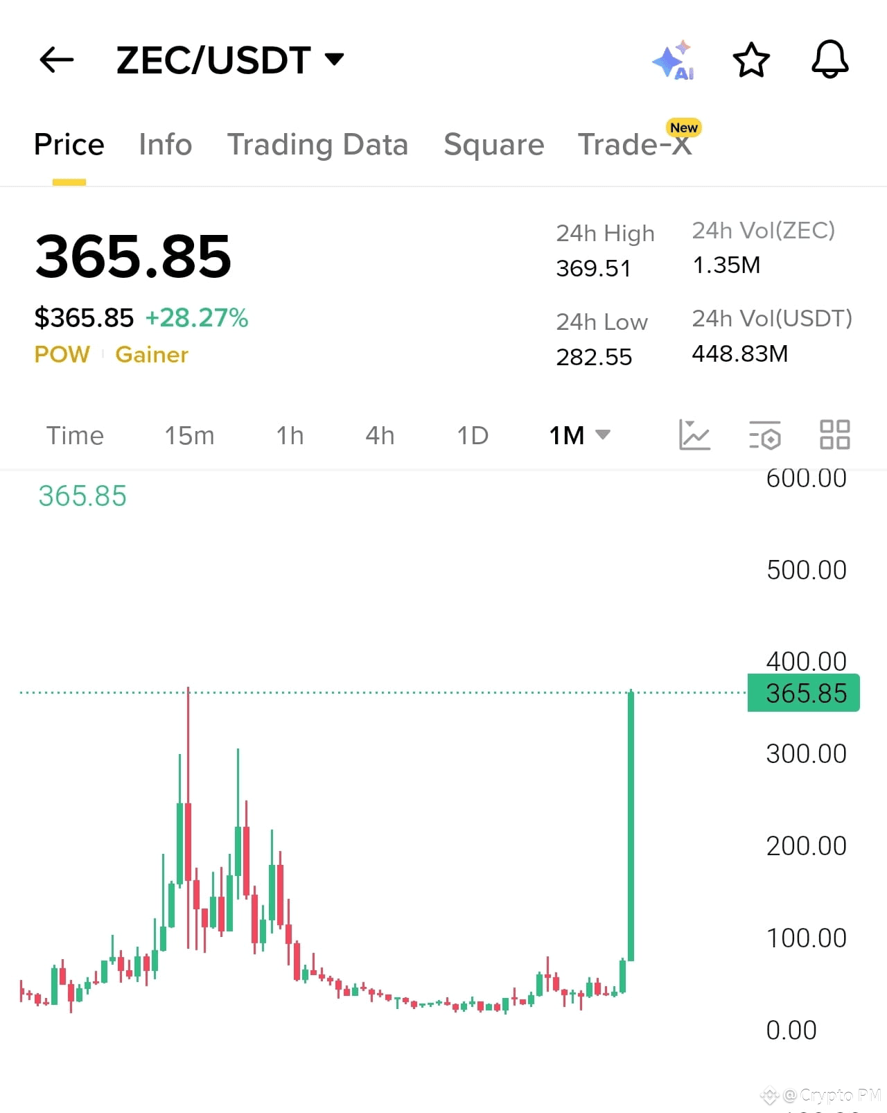 在几个月的横盘整理后,这次突如其来的反弹标志着 ZEC 多年来最强劲的走势之一——在短短 24 小时内,价格从低点 $282.55 上涨至高点 $369.51! ⚡