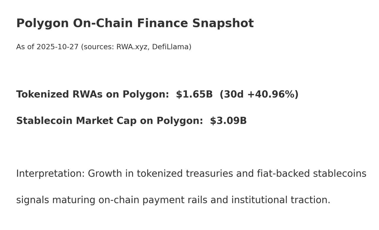 上述数据点的主要来源:Polygon 关于迁移和质押的博客、AMINA 银行的质押公告、RWA.xyz 的 Polygon 指标仪表板、Stripe 的 USDC 支付更新。