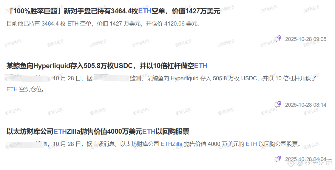 今天简直就是ETH的“黑色星期二”!三条快讯全是利空:第一,那个号称“100%胜率巨鲸”又加了3464枚ETH空单,开仓价4120美元,比现价还高,摆明了看空到底;第二,另一个鲸鱼更狠,存了505万USDC,用10倍杠杆做空ETH,这相当于借钱砸盘,风险大,但利润也狠;第三,以太坊财库公司ETHZilla抛了4000万美元ETH回购股票,机构都跑路了,散户还扛得住?