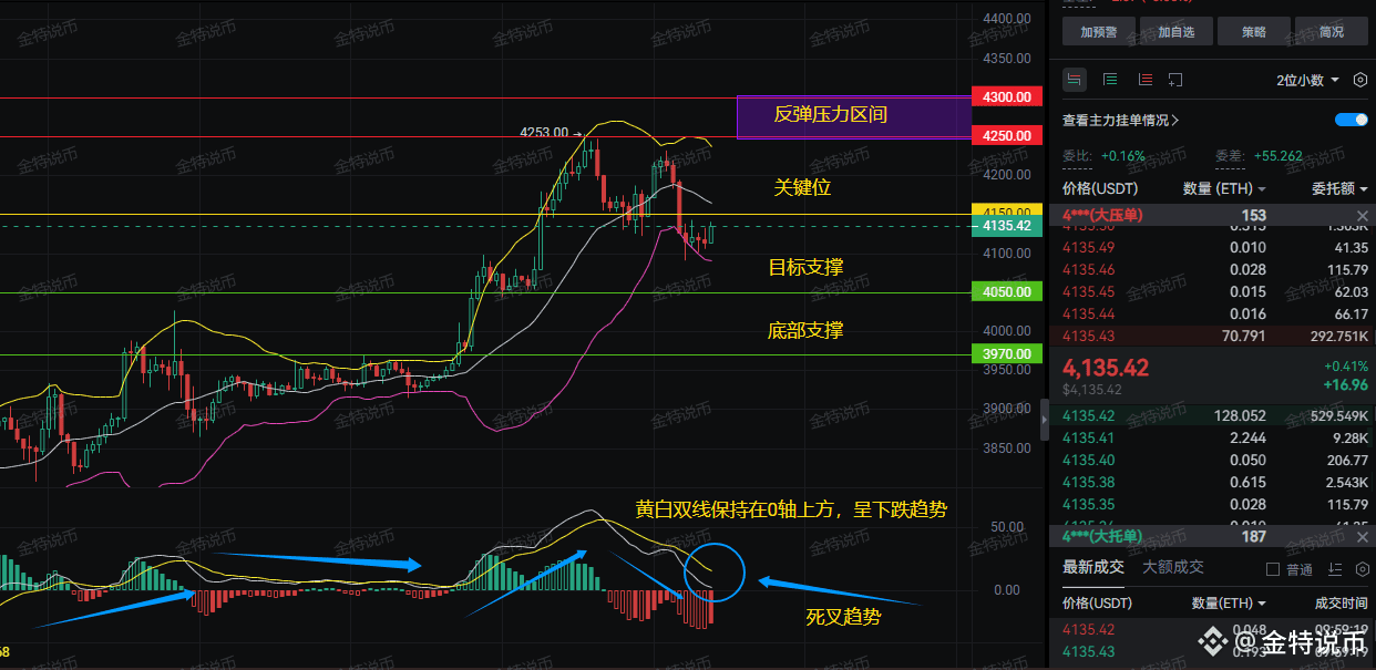 我是金特,今天早上,ETH又出大事了!价格跌破了4150这个关键位,现在卡在4135美元附近,而新闻上全是巨鲸做空、机构抛售的坏消息。这行情是要继续跌到4050,还是能反弹冲上4250?